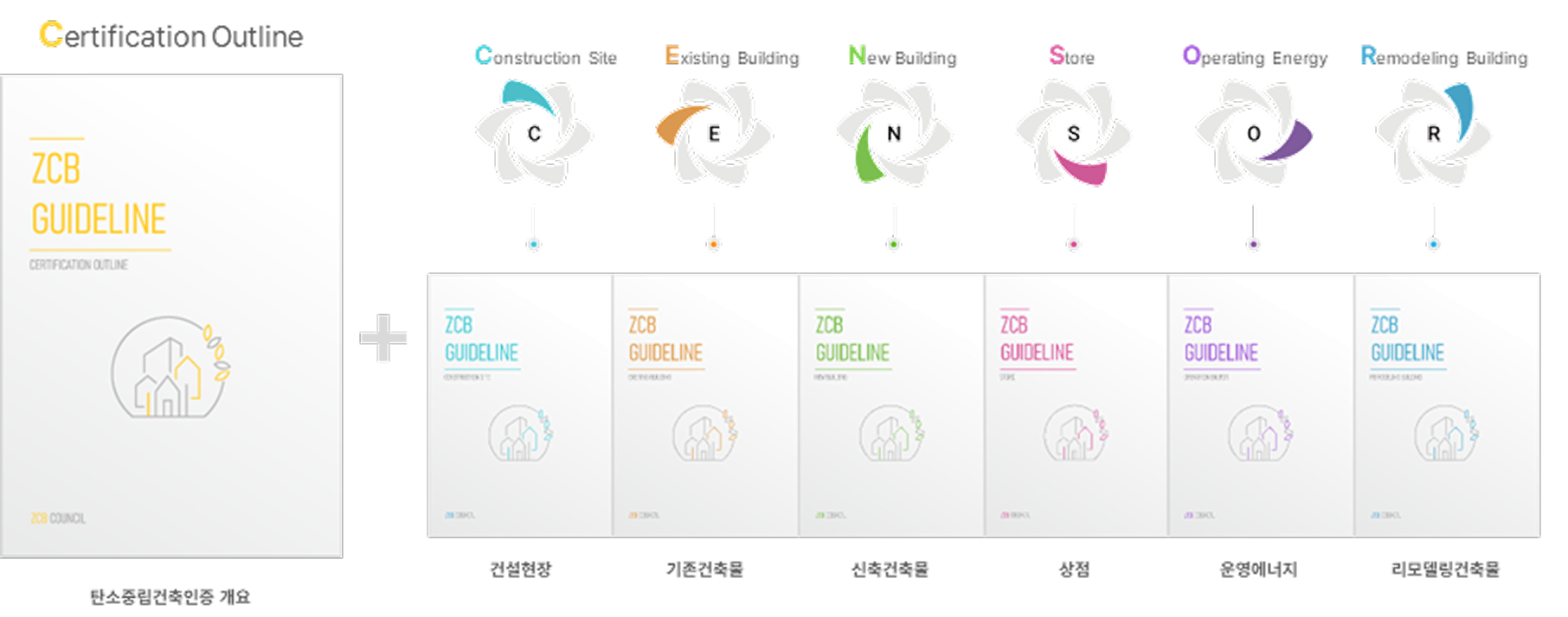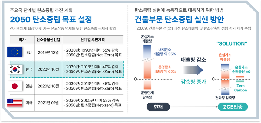 이에 따라, 2023년 9월 1일 “ZCB인증(탄소중립건축인증)”을 도입하여, 건축물·상점·건설현장을 시작으로 재료·도시 단위까지 확장 가능한 체계적 통합 시스템을 구축하고자 합니다. ZCB인증은 건설 전 과정의 산업군 참여를 유도해 전 산업의 저탄소 전환과 지속가능발전, 지구환경 보존에 기여하는 것을 목표로 합니다.