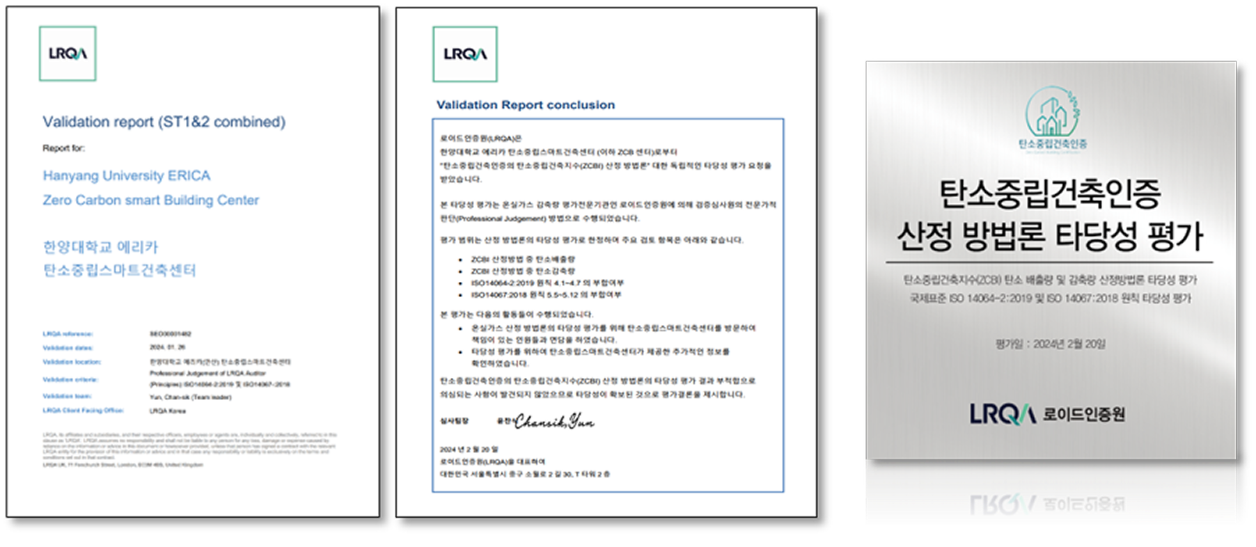 탄소중립건축지수(ZCBI)에 대한 전과정 탄소배출량 및 탄소감축량 산정 방법은 국제 온실가스 검증기관으로부터 국제표준 ISO 14064-2:2019 및 ISO 14067:2018 원칙에 타당성을 인정 받은 평가 체계입니다.