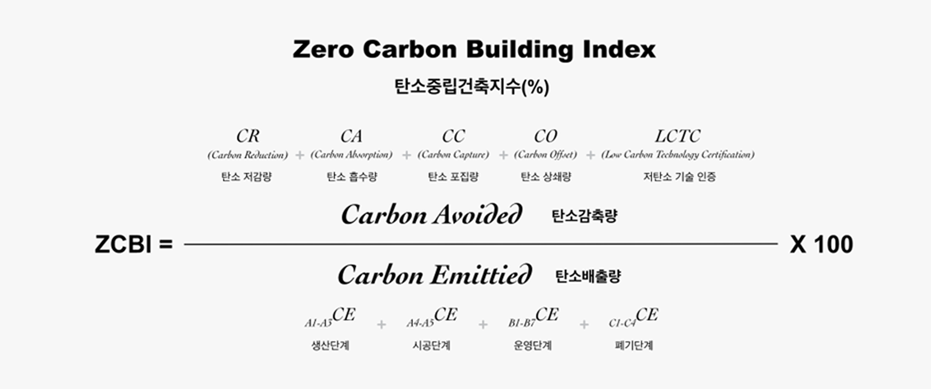 탄소중립건축지수(Zero Carbon Building Index)란 탄소중립건축인증(ZCB인증)에서 평가 결과로 도출되는 지수(Index) 로서, 건축물 · 상점 · 건설현장에 대한 인증 용도에 따라 설정된 시스템경계에서 발생하는 전 과정 탄소배출량(Carbon Emitted) 대비 다양한 탄소 감축 활동을 통해 감축되는 탄소감축량(Carbon Avoided)의 비율(%)을 의미합니다.