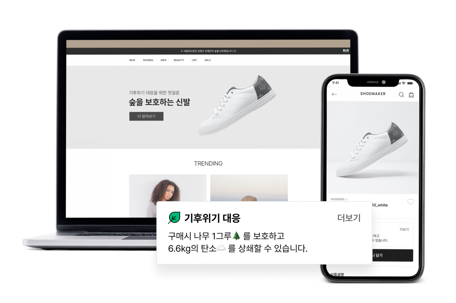전략적인 배너 노출 웹페이지 방문 시 소비자들에게 뱃지를 노출하여 브랜드가 기후위기 대응에 참여한다는 걸 알려요 | 쉽고 빠른 개발 연동 자사몰, 웹페이지 모든 화면에 대해 SDK를 제공, 별도의 화면 개발없이 빠른 설치가 가능해요 | 공신력있는 인증 기관 확보 전문기관과 협력중인 내일의쓰임 인증으로 친환경 검증 절차를 홍보할 수 있어요 |